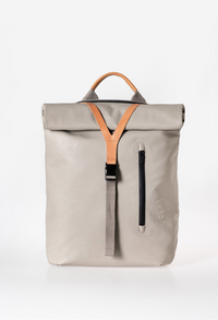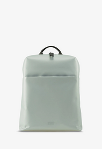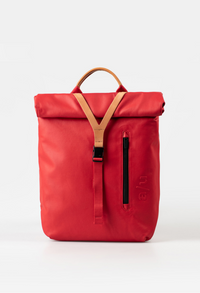 aunts&uncles, Rucksack, Frau mit Rucksack im Stadthof, lässiger Look, urbanes Umfeld, Vintage-Stil, olivgrün mit Lederdetails, nachhaltiges Design, Streetstyle, Outdoor-Atmosphäre